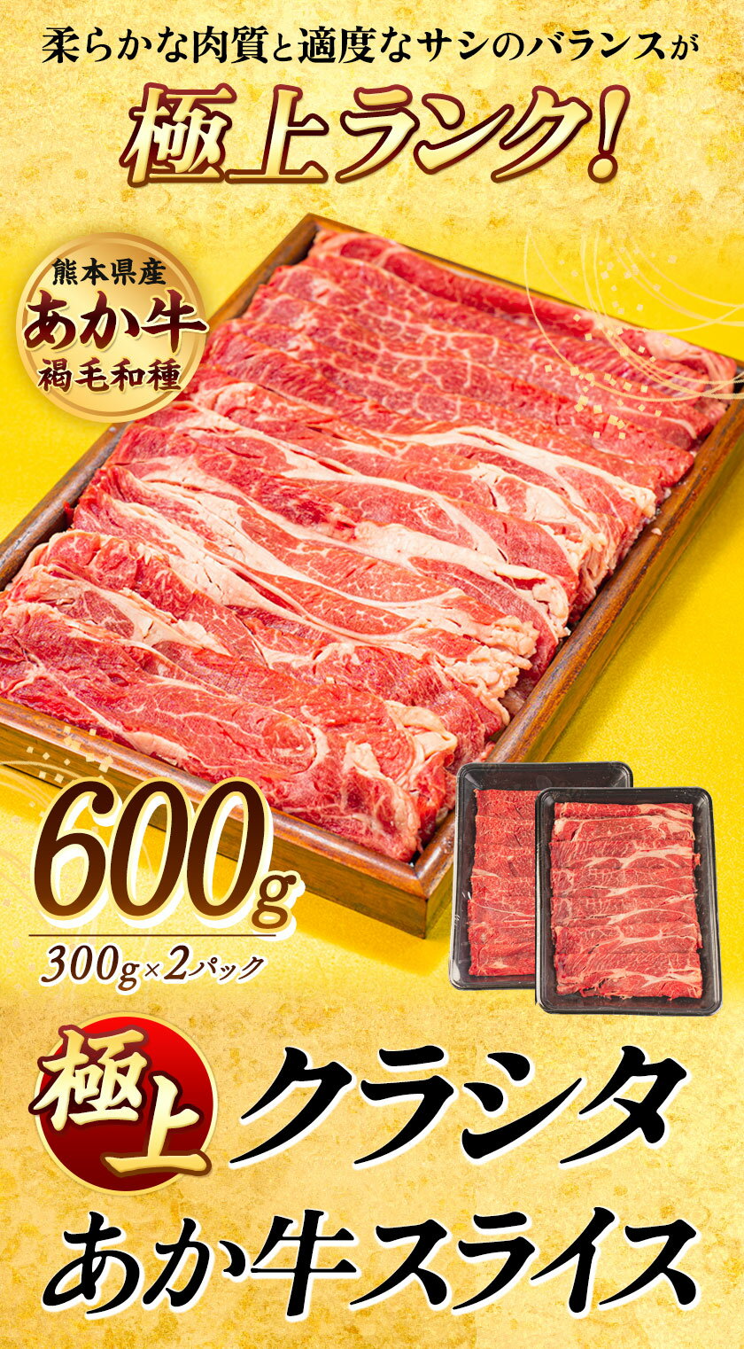 商品情報 熊本県産 極上あか牛クラシタスライス 名称 クラシタスライス 産地 熊本県産 内容量 600g(300g×2パック) 賞味期限 返礼品ラベルに記載 保存方法 -18度以下で冷凍 配送方法 冷凍便でお届けします。