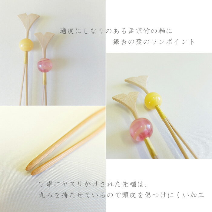 竹細工 とんぼ玉かんざし 銀杏 和装 浴衣 着物 髪飾り シンプル いちょう 涼感 手作り ハンドメイド 日本製 簪 孟宗竹 士心庵