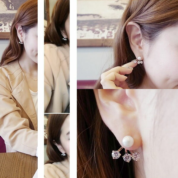 イミテーションのパールピアスに3連のビジューをセットした大人可愛いバックキャッチピアス。