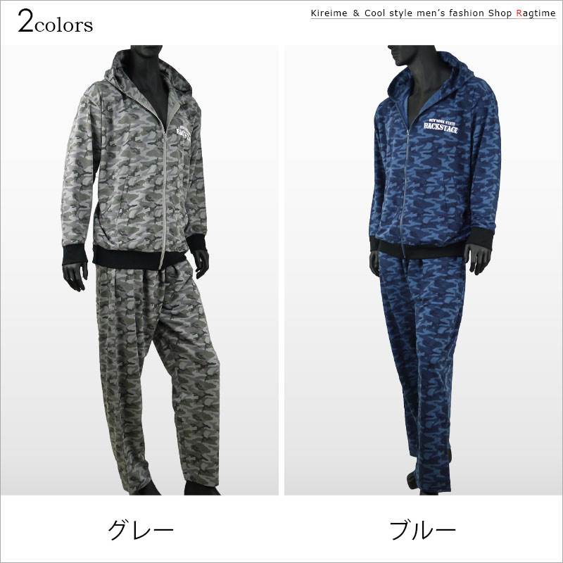 商品説明 カモフラ柄デザインがお洒落なCOLLINSのスウェットパーカー上下セット。