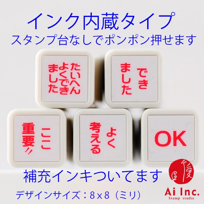 浸透印ごほうびスタンプ5本セット【たいへんよくできました・できました・ここ重要・よく考える・OK】かわいい浸透印スタンプ【シャチハタ式 ご褒美はんこ 評価印 5個】【ネコポス・定形外郵便対応】