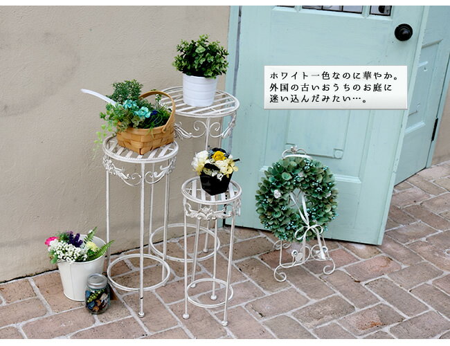 【ブランティーク ホワイトアイアンフラワースタンド 3点セット】まるでフランスの蚤の市で買い付けたような、雰囲気のあるガーデンファニチャー・シリーズあたたかな気持ちにさせてくれるフレンチ・アンティークフランス語で「白」を意味する「ブラン」に、アンティークな魅力をプラスしたシリーズ、「ブランティーク」。